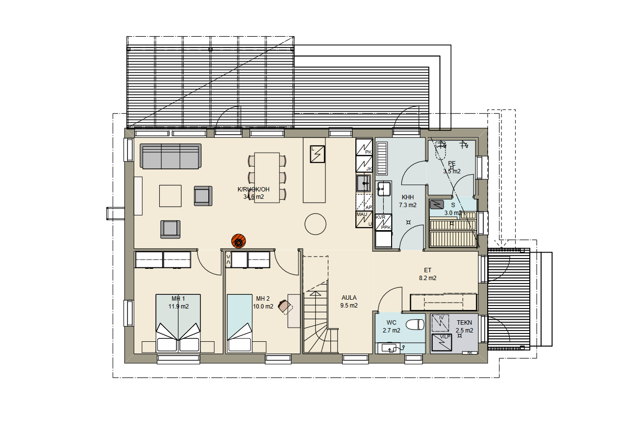 - 5 huonetta, keittiö, kodinhoitohuone, pesuhuone, sauna, 2 wc:tä, eteinen, aula, vaatehuone ja tekninen tila