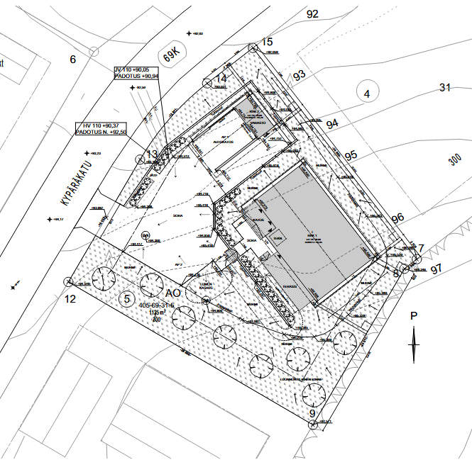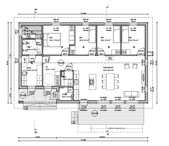 - päärakennus: 4 makuuhuonetta, keittiö, ruokailutila, olohuone, kodinhoitohuone, pesuhuone, sauna, wc, eteinen ja tekninen tila